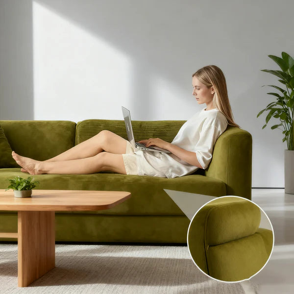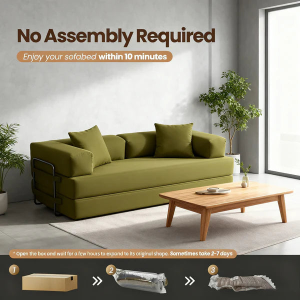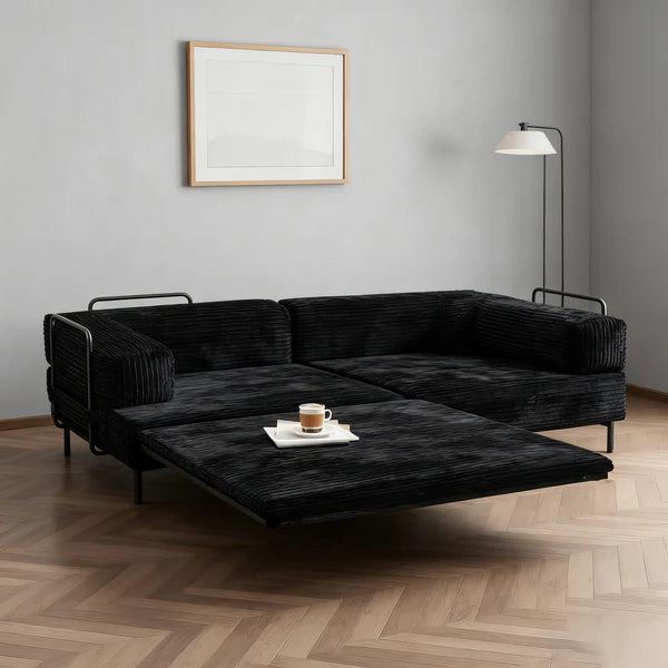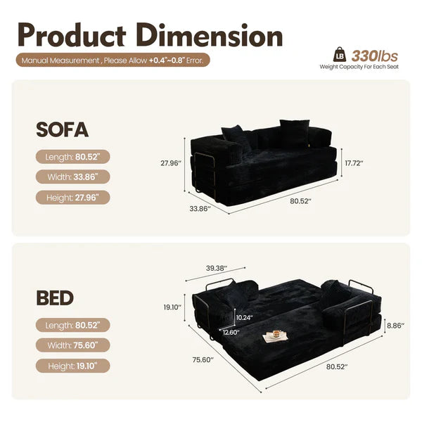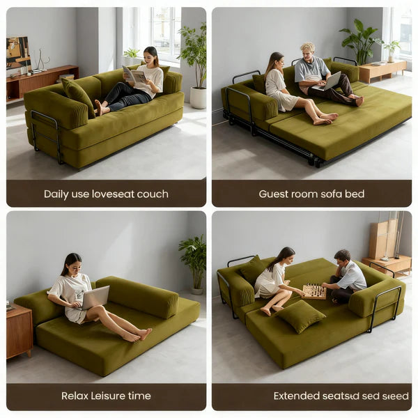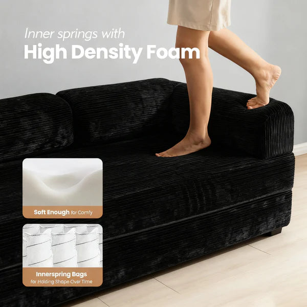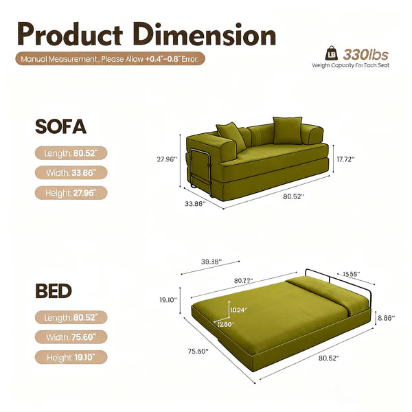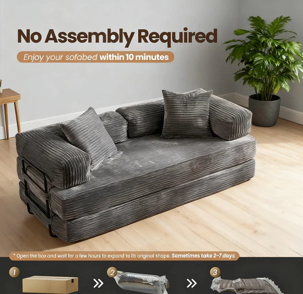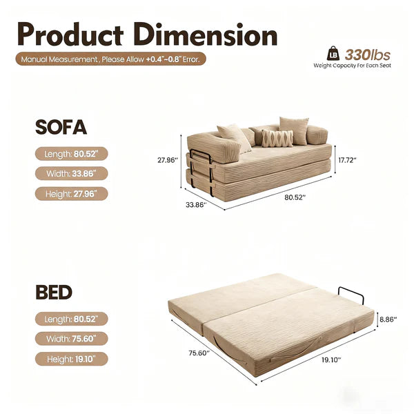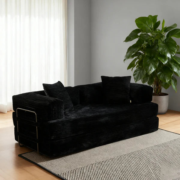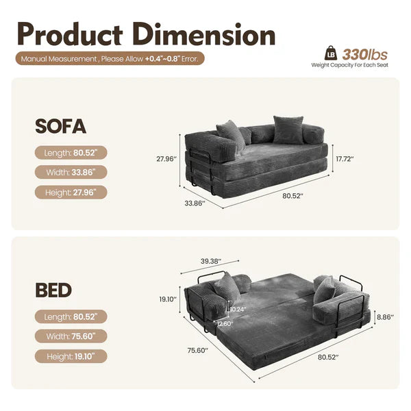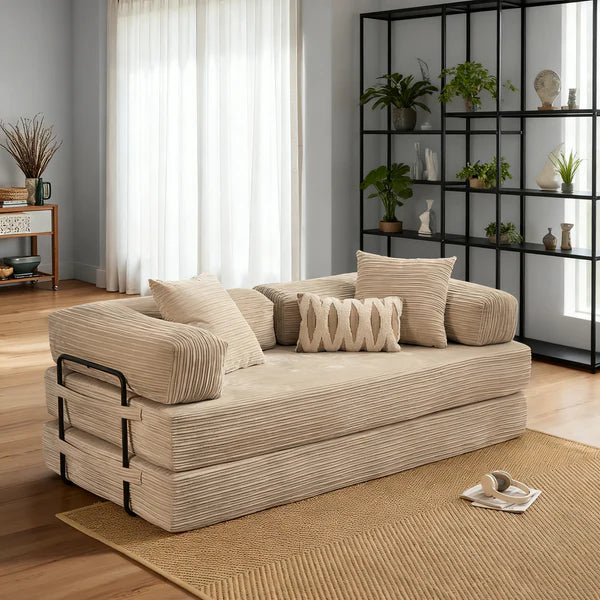 Made with high-density cloud corduroy fabric, this sofa bed delivers a luxuriously soft, cozy texture that feels smooth and gentle on the skin. Its breathable and temperature-adaptive surface keeps you cool in summer and comfortably warm in winter. Inside, high-resilience foam padding provides full-body support, preventing sagging or deformation even after extended use. The frameless construction and cushioned structure create a perfectly balanced “sink-in comfort” — plush yet stable, allowing you to relax fully without losing shape.