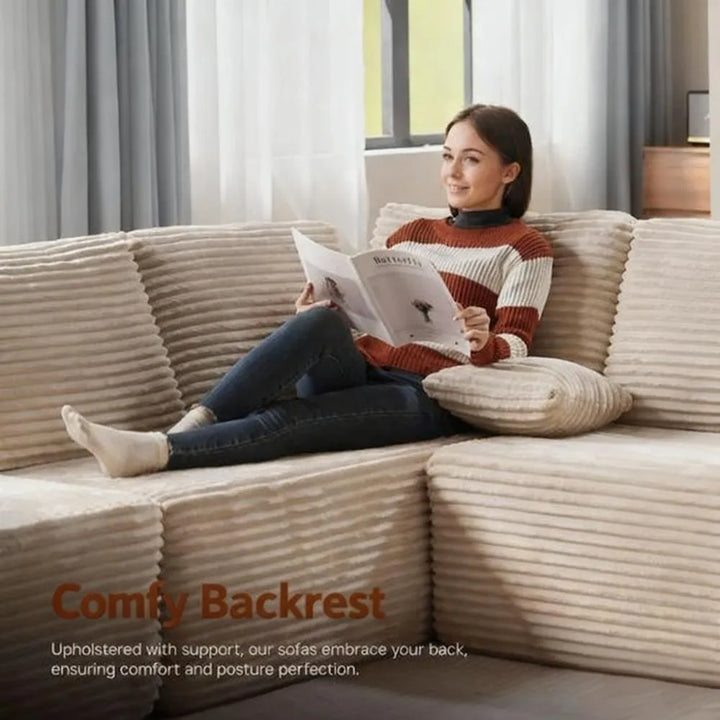 Elevate your living room with a luxurious corduroy sectional sofa. Its timeless, stylish design, clean lines, and striped accents bring an elegant touch to any interior style.