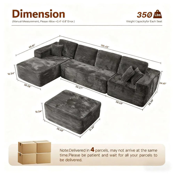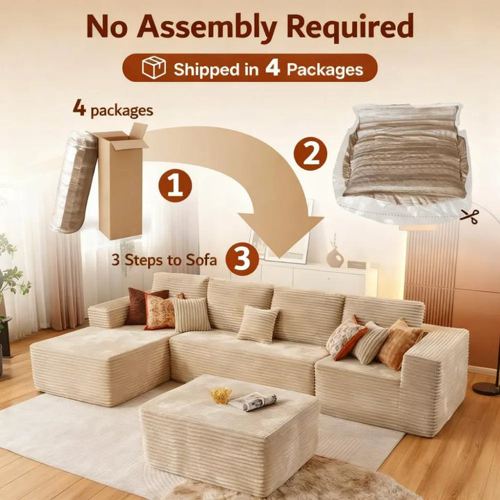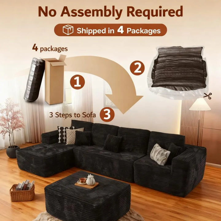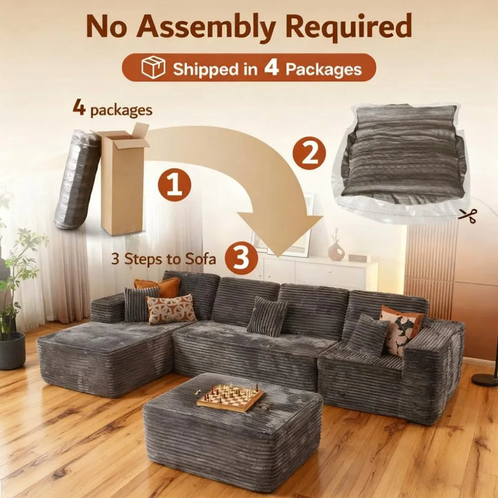 ● No Assembly Required: Easily assemble this cloud modular sectional sofa. Simply unbox all parts and lightly tap each segment to restore its bounce, bringing back its photogenic appeal. Full recovery may take about 72 hours. Enjoy the convenience of no assembly.